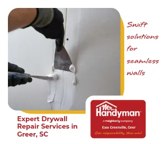 What sets Mr. Handyman apart in the drywall repair Greer SC market? It's our commitment to craftsmanship and customer satisfaction. Our technicians are licensed, insured, and background-checked, bringing years of experience to every job. We use dustless sanding techniques to minimize mess, and our repairs include priming and painting for a flawless finish.